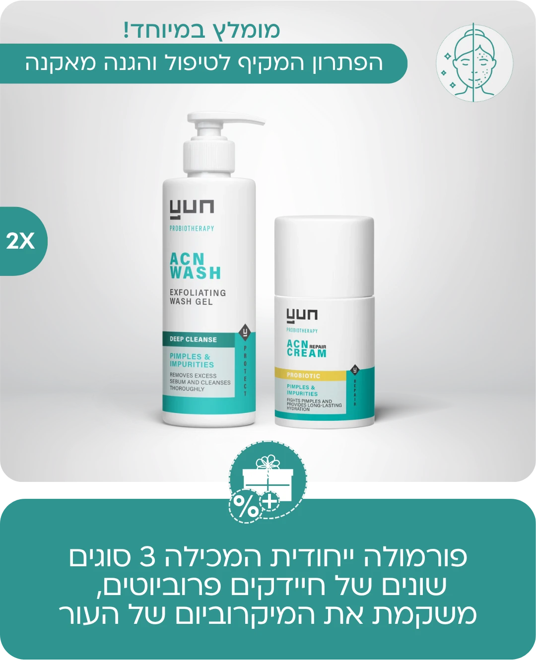 תכשירי YUN מכילים חיידקים פרוביטים (טובים) אשר כאשר מושמים על העור הם נלחמים באופן טבעי בחיידקים השונים ובמיוחד בחיידק האקנה.