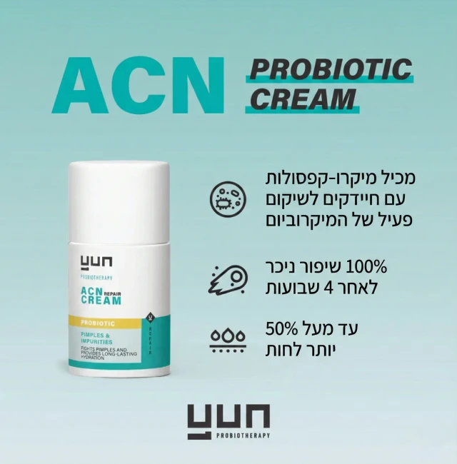 תכשירי YUN מכילים חיידקים פרוביטים (טובים) אשר כאשר מושמים על העור הם נלחמים באופן טבעי בחיידקים השונים ובמיוחד בחיידק האקנה.